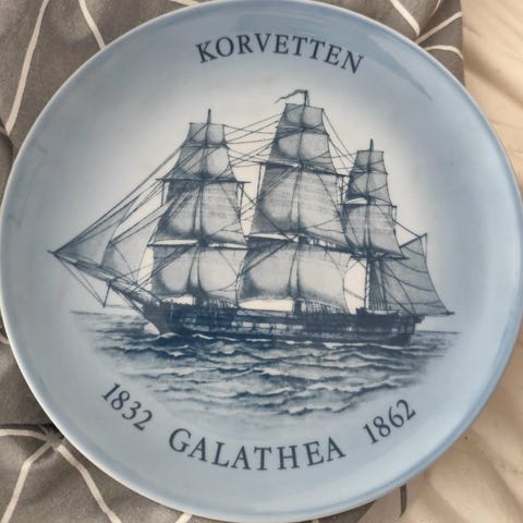 Flot hvid platte med guldkant fra Bing & Grøndahl med et motiv fra Fur i brun stregtegning. Denne platte har et havneparti fra Fur som motiv.