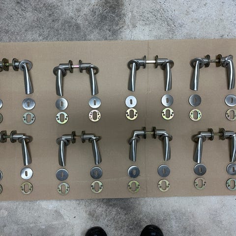 Håndtage/børstet stål/rustfrie. 14 håndtage og flere ting 4 forlængere til låse og 4 vrider til låse osv sælges samlet til super billig pris