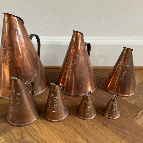 Smukt og velbevaret målebæger i kobber med indvendig fortinning. Fremstillet for ca. 150 år siden, sandsynligvis i anden halvdel af det 19. århundrede. Volumen: 1/4 liter. Højde: ca. 13 cm · Diameter: 5,5 cm.