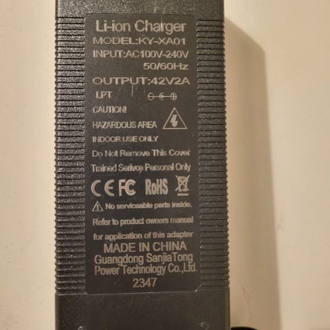 Batteriet er fra et defekt el løbehjul. Udmåling viser 42 v