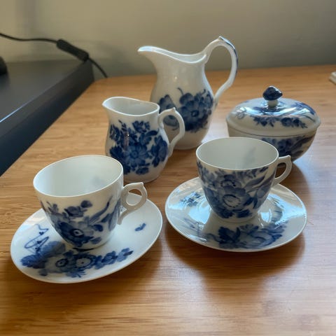 Sæt med 10 stk. the- og underkopper med flet, 2.-4. sortering (personalekøb) No. 8049 fra RC. Fin stand, 3 af kopperne har nogle ‘pletter’ se billeder. Der følger 2 ekstra kopper med til sættet. Kopperne er 10 cm i diameter og 5 cm høje. Underkopper måler 15 cm i diameter. Kan afhentes på Islands Brygge efter aftale. Jeg har ikke udfyldt forsendelse, da jeg tror det er for skrøbeligt….