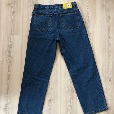 Baggy skate jeans fra Polar Skate co. Farven er washed black, de fremstår mørkegrå stonewash med gul syning. De er flittigt brugt: se billeder for slid fra skateboard v lommen, ved hælene og bagpå. Men Big Boys er svære at slide op, og der er fortsat mange gode timer skateboarding i dem.