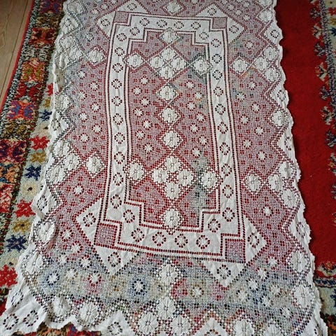 117x103, smuk vintage dug med spindelvævs vævet mønster og smukkeste blå bort. Denne er solgt.