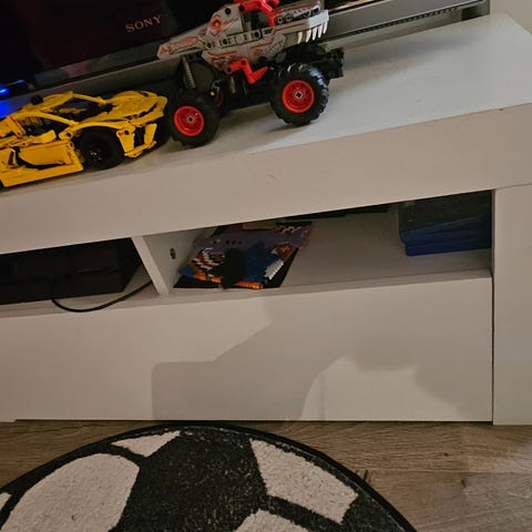 Hvide sidestykker i højglans med 3 hylder i tempered glass, Mærke: Tech Link. Rigtig god kvalitet. Ingen skår eller hakker. Mål: b: 40 cm, l: 110 cm, h: 52 cm. Hyldehøjde: 23,2 cm - samme højde for begge hylder. Virkelig fin stand.