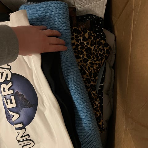 En del er næsten ikke brugt, og en enkelt top stadigvæk med prismærke. Tá hele poser for 175,-