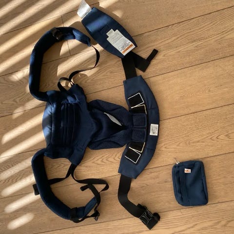 Ergobaby bæresele hvori barnet kan vende både ind mod kroppen eller ud mod verden. Den kan justeres til tre størrelser ved barnets numse (50 cm, 60 cm og 70 cm) og der er en nakkestøtte man kan slå op til de helt små eller hvis de falder i søvn. Der er et solsejl man kan folde ud som går over barnets hoved. Det er nemt at tage på selv hvis man er alene med barnet.