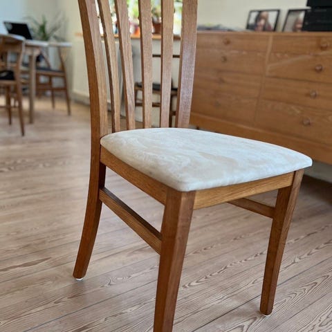 Den ene har et lille hul i ryglænet (se billede)