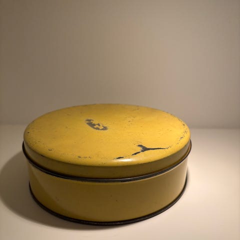 lille gul kagedåse med låg med en smiley på som har hjerte øjne.