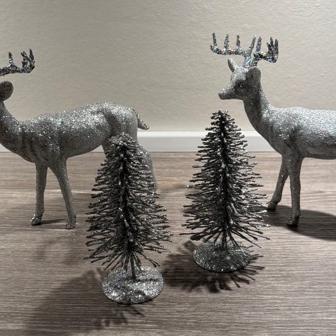 Rensdyr, stjernestager, julepynt, glas, lysestager, Smukt, hvidt glitter-rensdyr med sølvkrone: 60 kr.