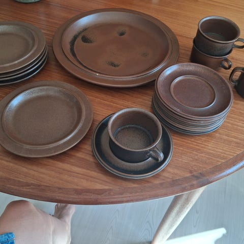 10 kaffe over og underkopper, 12 sidetallerkner. 1 sukkerskål med låg og flødekande. Ovalt fad 25x35 cm, og rundt fad 25 cm. 6 tekopper med underkopper og 6 sidetallerkner. Alt i god stand uden skår. Sælges kun samlet.