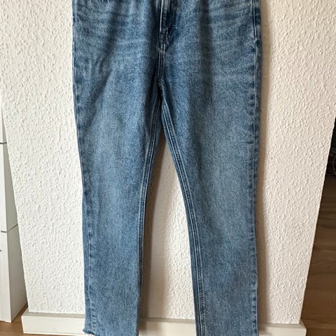 Mørkeblå jeans med en slank pasform. De har klassiske detaljer som lommer foran og bagpå, samt en lille møntlomme. Jeansene er designet med synlige syninger og en knaplukning i taljen.