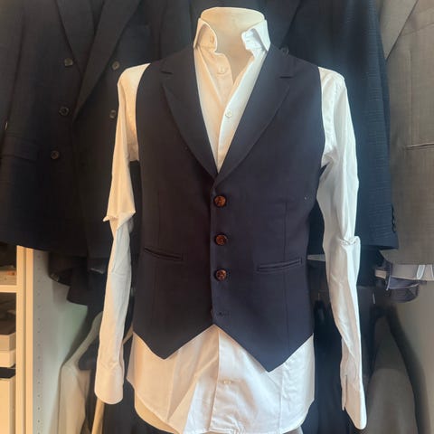 Flot mørkeblå vest til jakkesæt. Kan reguleres i ryggen. Vesten har lommer og knapper. Størrelsen er gættet - vesten måler ca. 65 fra top til bund og ca. 55 cm på tværs (under armene) og ca. 52,5 cm på tværs (ved lommerne). Alle mål er taget mens vesten ligger fladt på et bord. OBS på tråde der begynder at løbe (se de sidste to billeder - farven vises på disse billeder forkert for at have fokus på trådene).