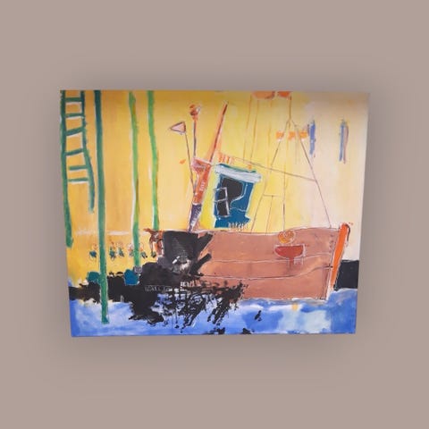 Stort Maleri i gråblå farver ligner sejlbåd.