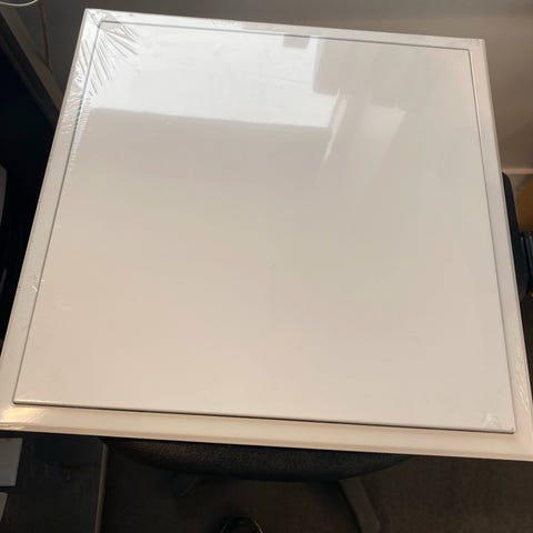 Hvid inspektionslem i metal, monteringshul = 20X20cm, ydermål = 23,5X23,5cm, Kiggehul = 19,5X19,5cm.