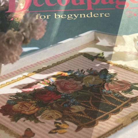 Decoupage er en skøn og kreativ kunstart, hvor mange små udklippede dele, f.eks. motiver fra gamle blade, udklipshæfter, glansbilleder mv., sættes sammen til et nyt billede.
