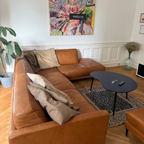Dejlig stor lædersofa med chaiselong. Her er plads til hele familien 😄