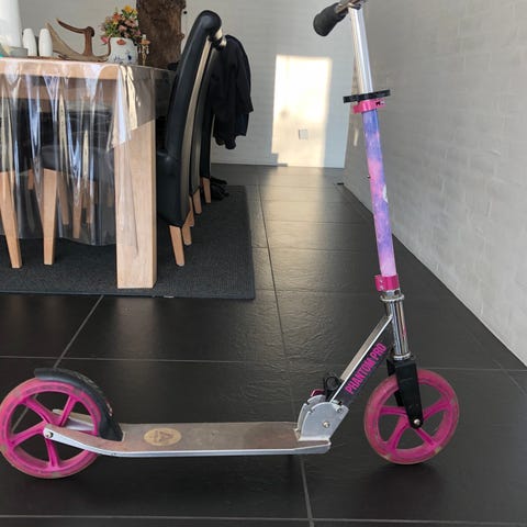 Farverigt løbehjul med mellemstore 145 mm hjul. Perfekt til de ca. 5 - 8 årige. Det er et ergonomisk løbehjul med justerbar højde på styret samt bløde greb. Med bremse bagpå som barnet let kan træde på. Det kan klappes sammen og derfor nemt tages med på farten. Brugt ca. et halvt år. Kører rigtig godt. Maksimal bæreevne = 100 kg.