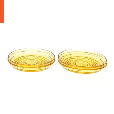 Serveringsskål og 5 assietter i pressemønster Broksø fra Holmegaard/Kastrup Glasværk mellem 1938 og 1976 designet af Jacob E. Bang.