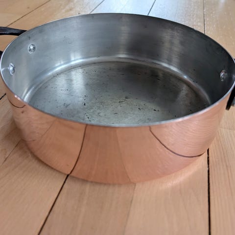 Ældre pande i kobber og formodentlig tin inderside - det er ikke stål, som kan tåle højere varmegrader end denne. Men den er i god stand - den har ikke været min og kan derfor ikke svare hvor effektiv den er. Men den har jo ingen pfas belægning, som er sundhedsskadelig.