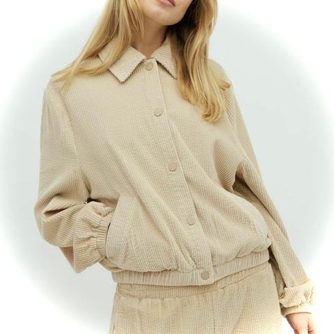 Med paspolerede lommer foran og rynkeeffekt på ærmerne