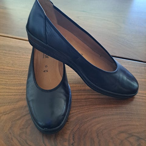 Klassisk sort ballerina i skind med lak på hæl og tå. Indersål trænger til at blive skiftet. Ydersål er fin og med kilehæl.