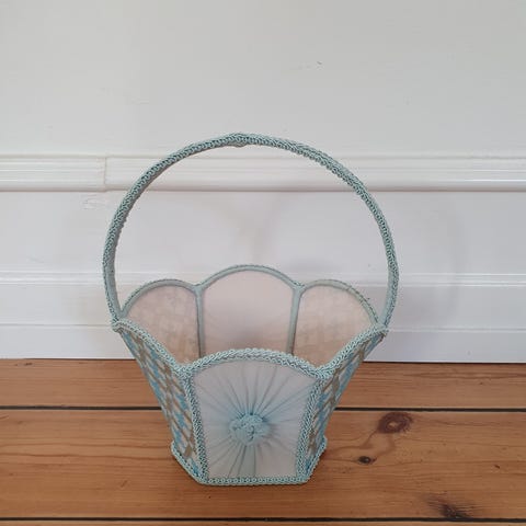 1 - smuk pastel pink miniature forfængelighedskurv af stof med håndtag metallisk trim og smukke detaljer. Fransk stil. 1950. Meget godt velholdt.