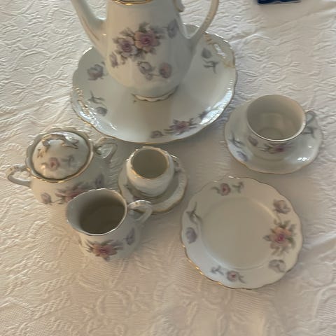 Fedt retro orange stel med mange tallerkner og tilbehør