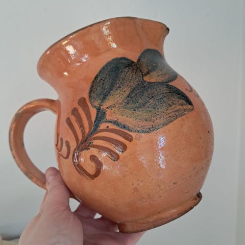 2. ældre kande i skønne farver, løbeglasur, ganske lidt slidt ved hældetud og kant...intet af betydning. H 11,5 cm dia 10,5 cm 85 kr.