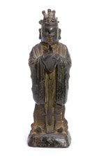 Kinesisk figur af patineret bronze i form af embedsmand, stående med samlede fødder og iført folderig dragt, begge hænder holdende en Hu plade.
