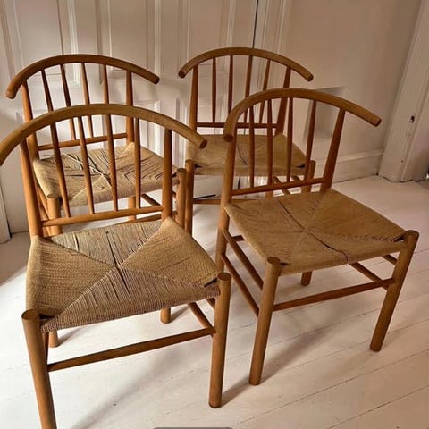 4 armstole af massiv bøgetræ, tremme ryg og drejede ben designet af Erik Ole Jørgensen og er dansk design fra 1960’ erne. Stolene produceres ikke længere og er derfor sjældne. Armlænshøjden er 67 cm og ryg højden er 91 cm. Kommer fra ikke dyre og ikke ryger hjem og sælges kun samlet. Prisen er pr. stk