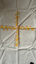 Rund retro dug med 16 håndbroderede kyllinger. måler i dia 130 cm.