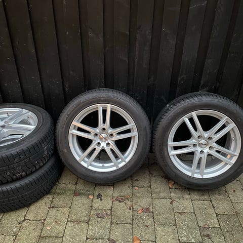 Vinterdæk med fælge med en diameter på 17 tommer i sølvfarvet finish. Dækkene er vinterdæk, designet til brug under kolde og glatte vejforhold. Fælgene har 5 eger.