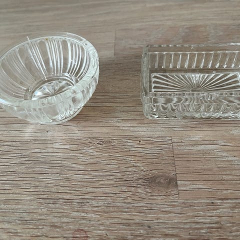 Retro glas saltkar fra Transsylvanien. Den har lidt ujævnheder i glasset, samt et par skår - se billeder - men er ellers i god vintage stand. Diameter ca 10 cm