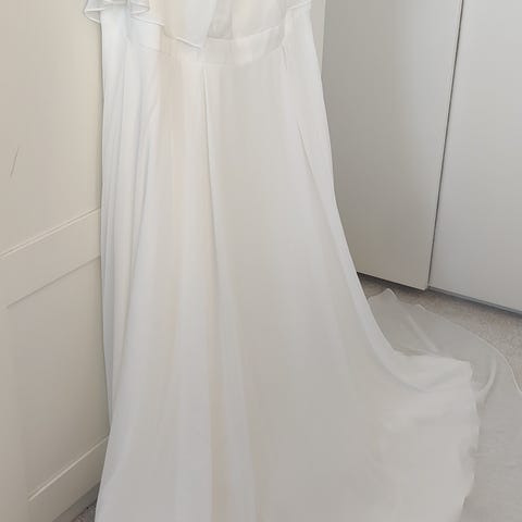 Sender ikke. Smuk brudekjole,prøvet og ikke brugt.Hele brudekjolens længde,målt fra skulder og ned, er den 155 cm. Målt på blonden der deler overdel og skørt,er omkredsen 106 cm. Har det smukkeste og bløde blonder for og bag ,de strækker sig ud på det lille ærme.Har V udskæring,og lukkes med usynlig lynlås på ryggen. Underkjolen er i lækker blød satin med 2 lag tyll over sig.Det giver hele kjolen en dejlig blød fald. Jeg er 157 H og str 54, og den passer mig,jeg valgte dog en anden løsning end brudekjole.Har derfor også en brudekjole fra La Princessa til salg,se evt min anden annonce med den :)