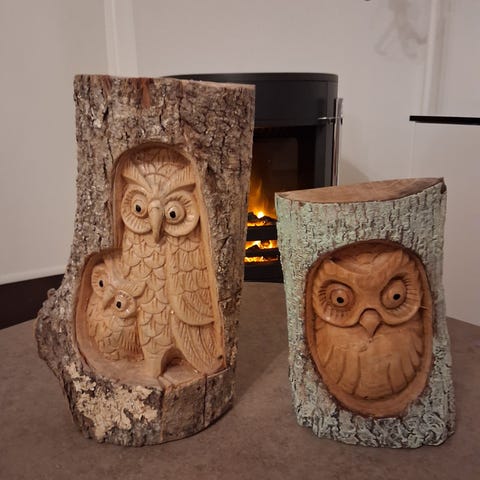 midcentury 1930-40 ugle bogstøtter i udskåren træ, uglerne er bemalet.