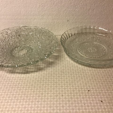 Serveringssæt af presset glas med romantisk reliefmønster.