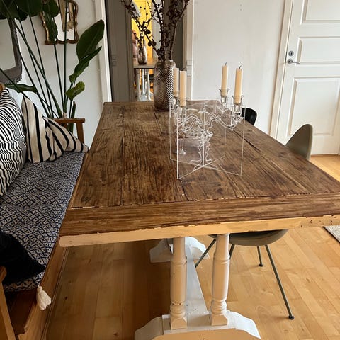 Bordet er i høj kvalitet og står i en god stand, med mindre brugsspor i bordoverfladen, som man ikke lægger mærke til og ikke behovet at dække til.