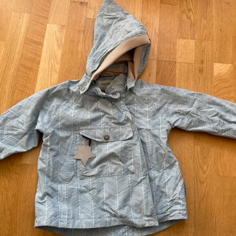 Blå overgangsjakke fra MiniATure med mange fine detaljer. Aftagelig hætte. Mange lommer på bryst og mave samt en enkelt lomme på venstre arm. Kan knappes op i siden, alt efter hvor tæt den skal sidde nederst. Kan gennemknappes over lynlåsen. Kan snøres ind i taljen. Har en lille plet ved det ene ærme og en anelse slid (se billede)
