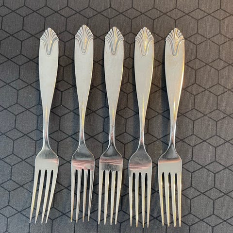 5 gafler i sølvplet. Er fra mine bedsteforældre. Skal pudses. Se billed med stempler. Sælges for 50 kr. samlet
