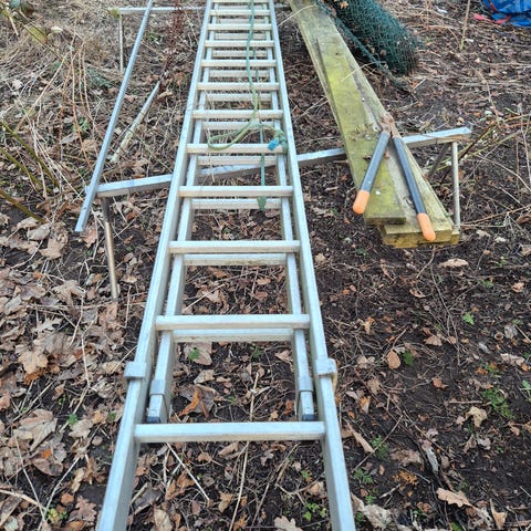 Udtræksstige - 4 meter udskudt længde. Stigen har stået indendørs - pris er inklusiv tilbehør 🌸