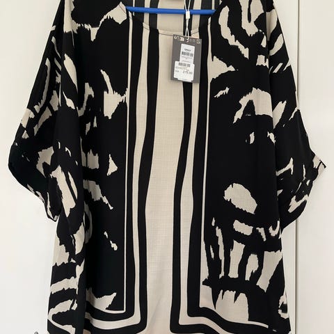Blusen er sort med brændt orange blomster i efterårsfarver. Står som ny.
