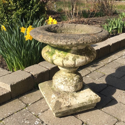 Ca 70 cm høj fransk sandstenskrukke, gamle med patina