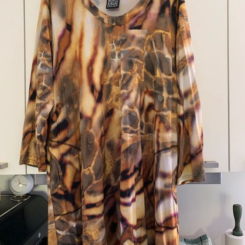 Længde fra skulder og ned ca. 107 cm, brystvidde ca. 2 x 51 cm (uden at strække stoffet, vidden kan blive større grundet stretch i stoffet),