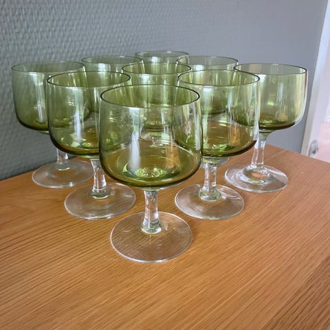 5 grønne hvidvinsglas, højde 11,5 cm, 75 kr pr stk. Alle solgt.