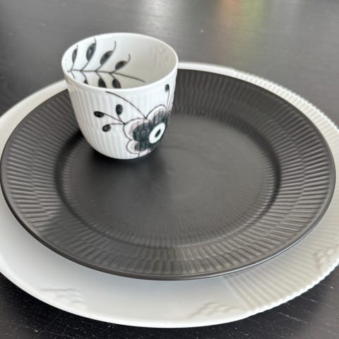 Royal Copenhagen sort riflet tallerkner og kopper.