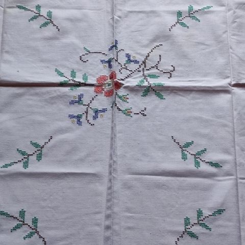 Smuk broderet vintage dug fra min farmor sælges. Den er kvadratisk og måler 113 x 113 cm. Smukke broderinger og sygninger