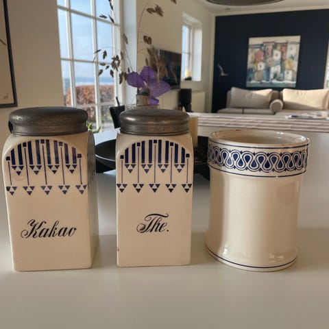 Fine gamle krukker til kaffe og te med korklåg.