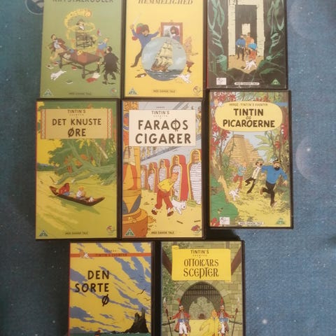 Retro tegnefilm på VHS med de charmerende 60'er-filmatiseringer af den kendte og elskede belgiske tegneseriefigur TinTin, der blev skabt i 1929 af den belgiske tegner Georges Remi, der skrev under pseudonymet Hergé.