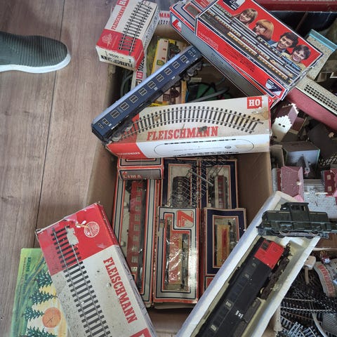 dette er en analog bane, der er gamle my fra fleischman fra 1963, mange vogne og toge der ikke har været pakket ud til andet en prøvekørsel,alle toge der ikke er udstillingstoge er kørende og virker, alt i tilbehør, ekstra huse, trafoer, skinner, maling, græs, ja og sikkert meget mere at jeg har glemt. Kom med et godt bud