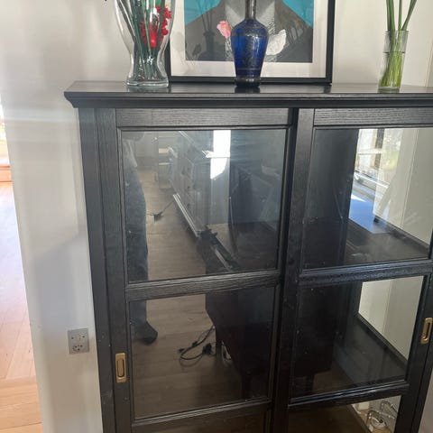 Sælges meget billigt: kan være brugt som vitrineskab med glas låger (der kan flyttes) eller uden som en reol til bøger m.m